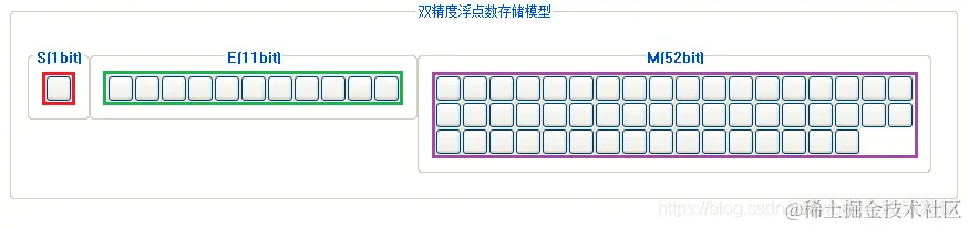 对于64位的浮点数,最高位1位是符号位S,接着的11位是指数E,剩下的52位位有效数字M: