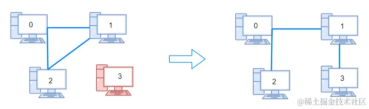connections将两电脑连线,生成点集,此时未连接电脑数量会减少。当点集增大到包含3个及以上时,从connections取出一条新的网线信息,则需要判断,该线的两台电脑是否已连接,如果已连接,就将未连接电脑数量--,反之不做任何处理 -
