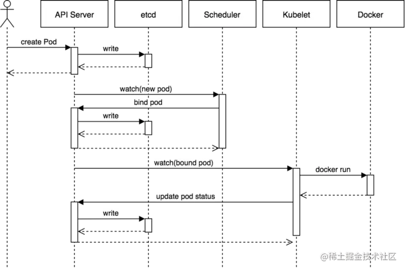 - 最后 kubelet 通过 container runtime 取到 Pod 状态,并更新到 apiserver 中