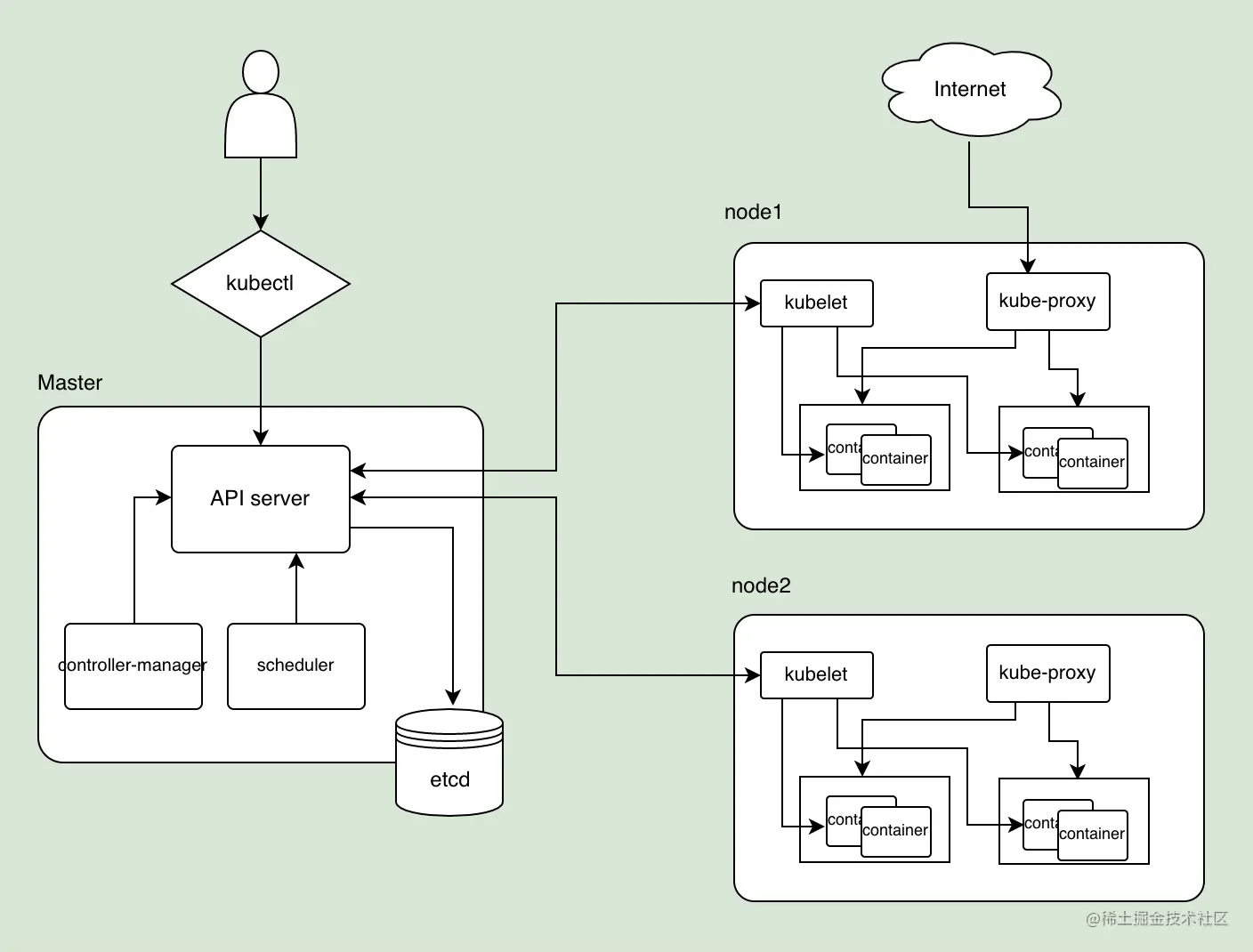 - Master:作为控制主节点,对集群进行调度管理;协调集群中的所有活动,例如调度应用程序、维护应用程序的所需状态、扩展应用程序和滚动更新。由 API Server、Scheduler 和 Controller-Manger Server 组成;