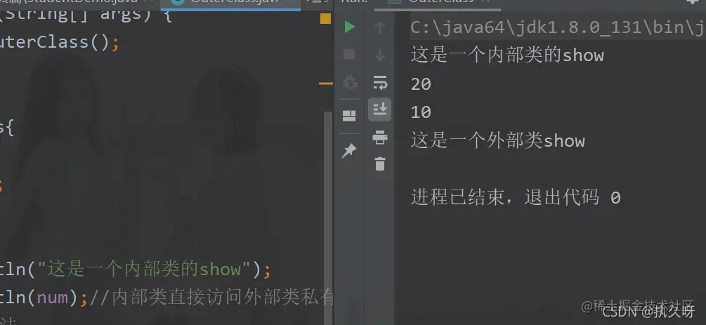 - 外部类通过创建对象也可以方法内部类的私有和非私有成员