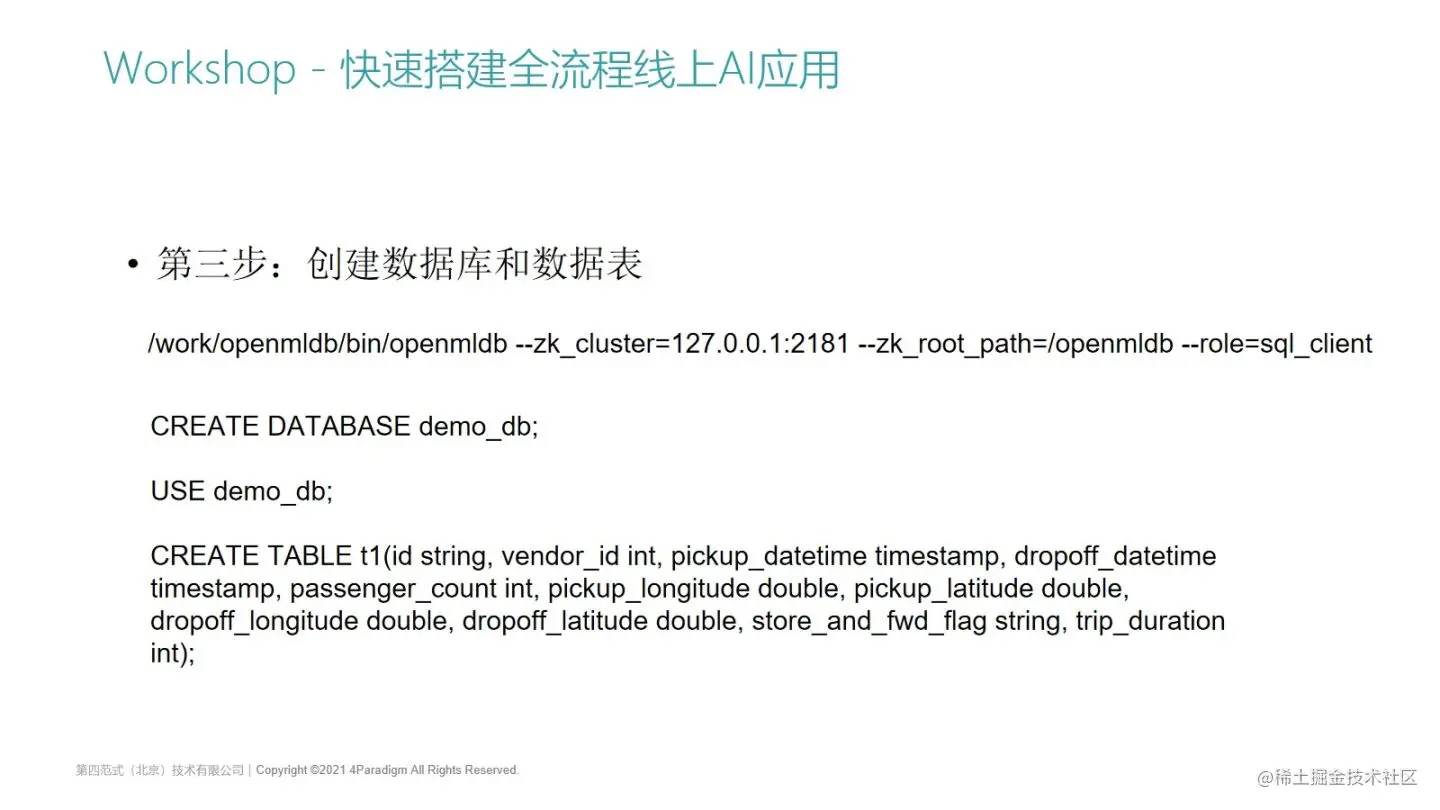左边的列表就是我们在做端到端AI应用落地的8个步骤,分别是:创建数据库、创建数据库表、导入离线数据、进行离线的特征抽取,然后使用机器学习框架进行模型训练、部署SQL上线、导入在线数据,以及上线在线特征服务。