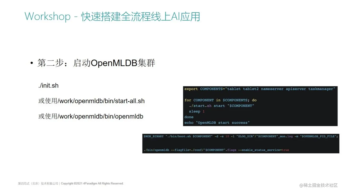 第二步就是启动OpenMLDB集群,可以使用init.sh(我们封装好的一个脚本),或者OpenMLDB项目里面提供的start脚本,也可以直接用自己编译的Binary来启动。