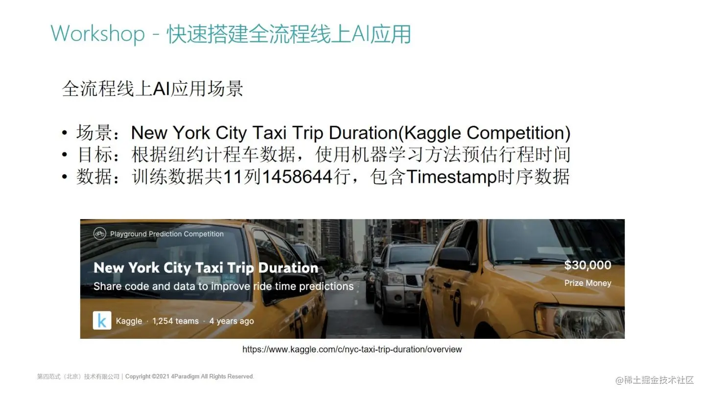 这是我们演示的场景,一个Kaggle的竞赛,叫New Your City Taxi Trip Duration,一个预估行程时间的机器学习场景。我们会下载比赛提供的一个计程车历史行程数据,开发者或者建模科学家需要根据这些数据,使用机器学习的方法,来预估新给出的测试集来预估行程时间。训练数据并不大,一共是11列,大概是100多万行,它的特点是包含了Timestamp的时序数据,对于行程预估场景时序数据是比较重要的。我们需要根据每个出租车行驶的历史记录,还有前序的一些特征,来做最终行程时间的预估。