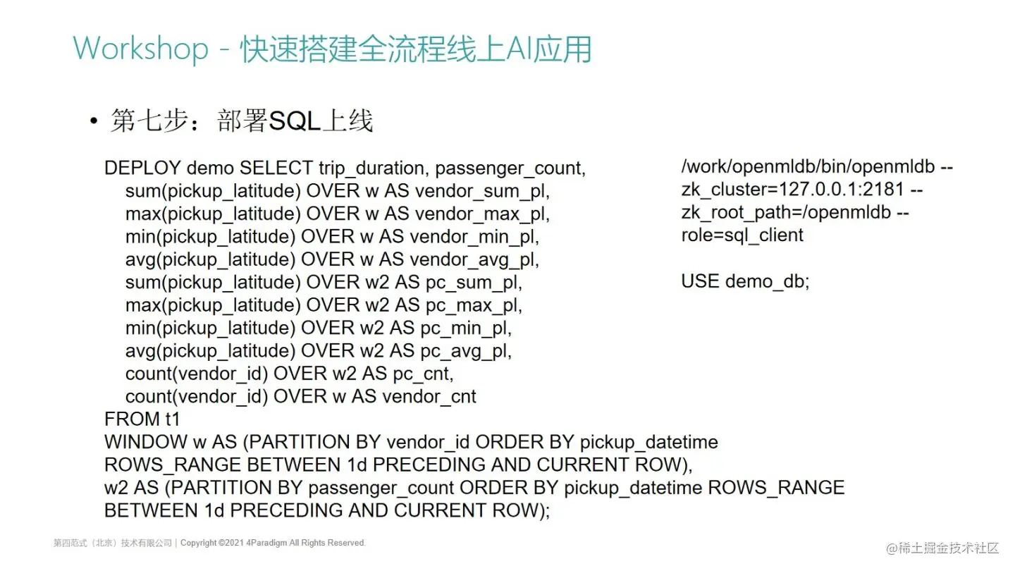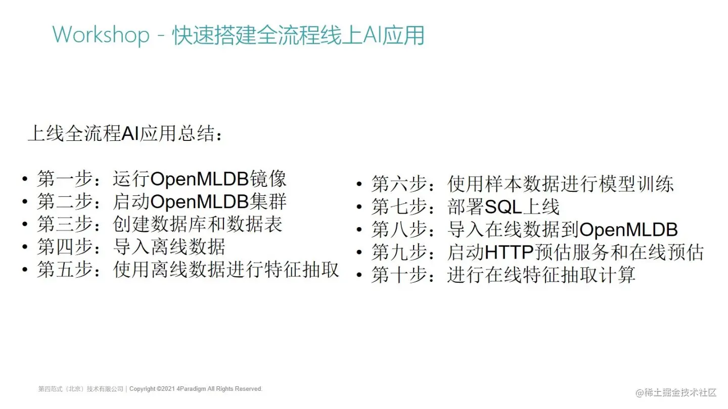 那么总结一下上线全流程AI应用的10个步骤,其实前面都比较简单,就是启动openMLDB集群,创建数据库,创建表,然后进行离线数据导入和离线的特征计算。当特征抽取的SQL没问题以后,我们就可以做SQL的上线了,上线后会启动一个支持http的预估服务,然后进行一个预估。在0.4.0版本中,几乎所有步骤都可以在SQL的命令行上执行和支持。未来我们也计划去支持基于命令行的在线特征抽取,甚至可以在命令行上拓展SQL语法来支持在命令行上做模型的训练等。