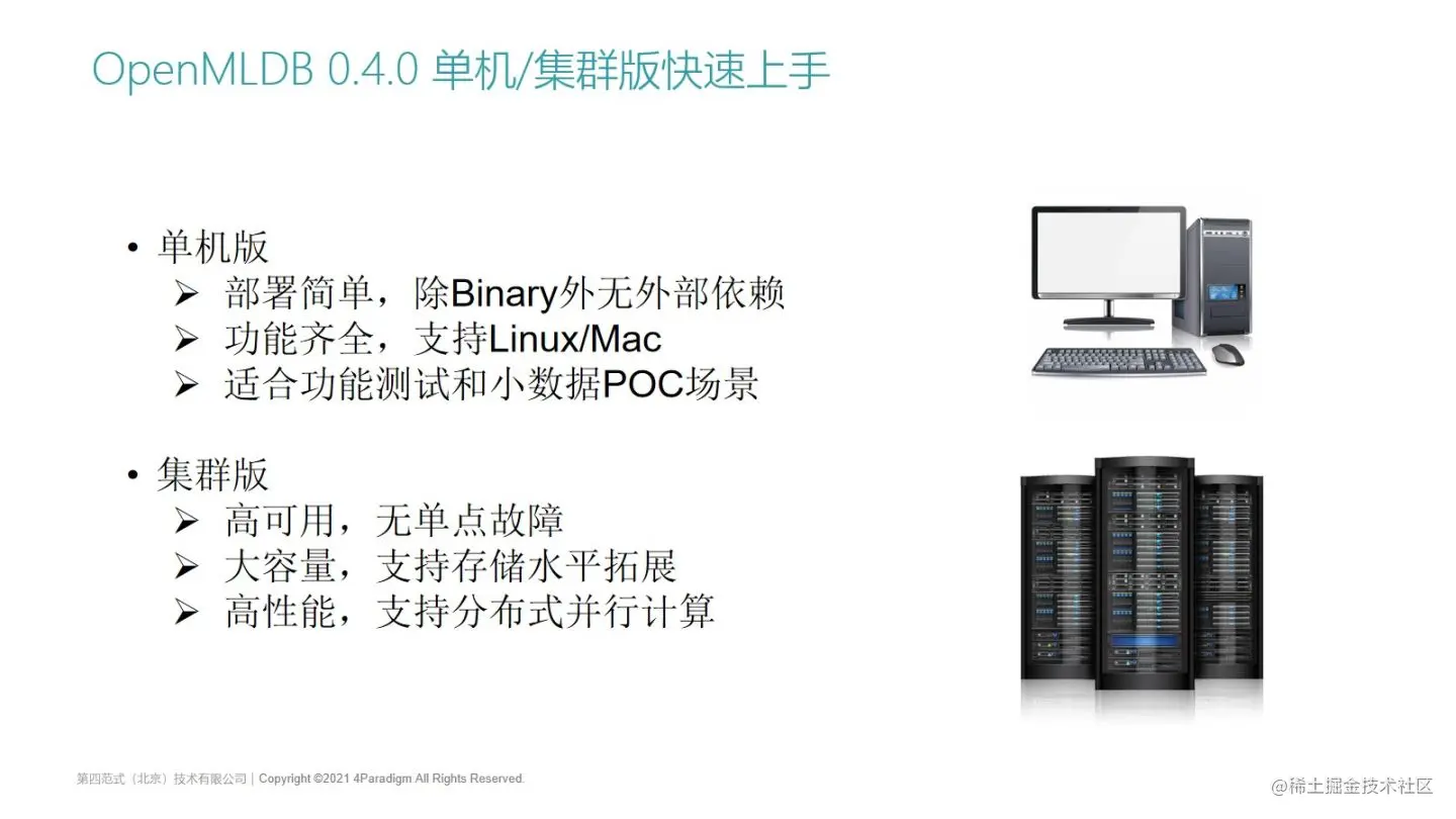 - 它是高性能的,无论是离线计算还是在线计算,集群版都可以支持分布式的并行计算,加速建模和特征抽取的时间。