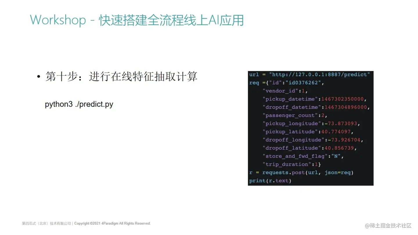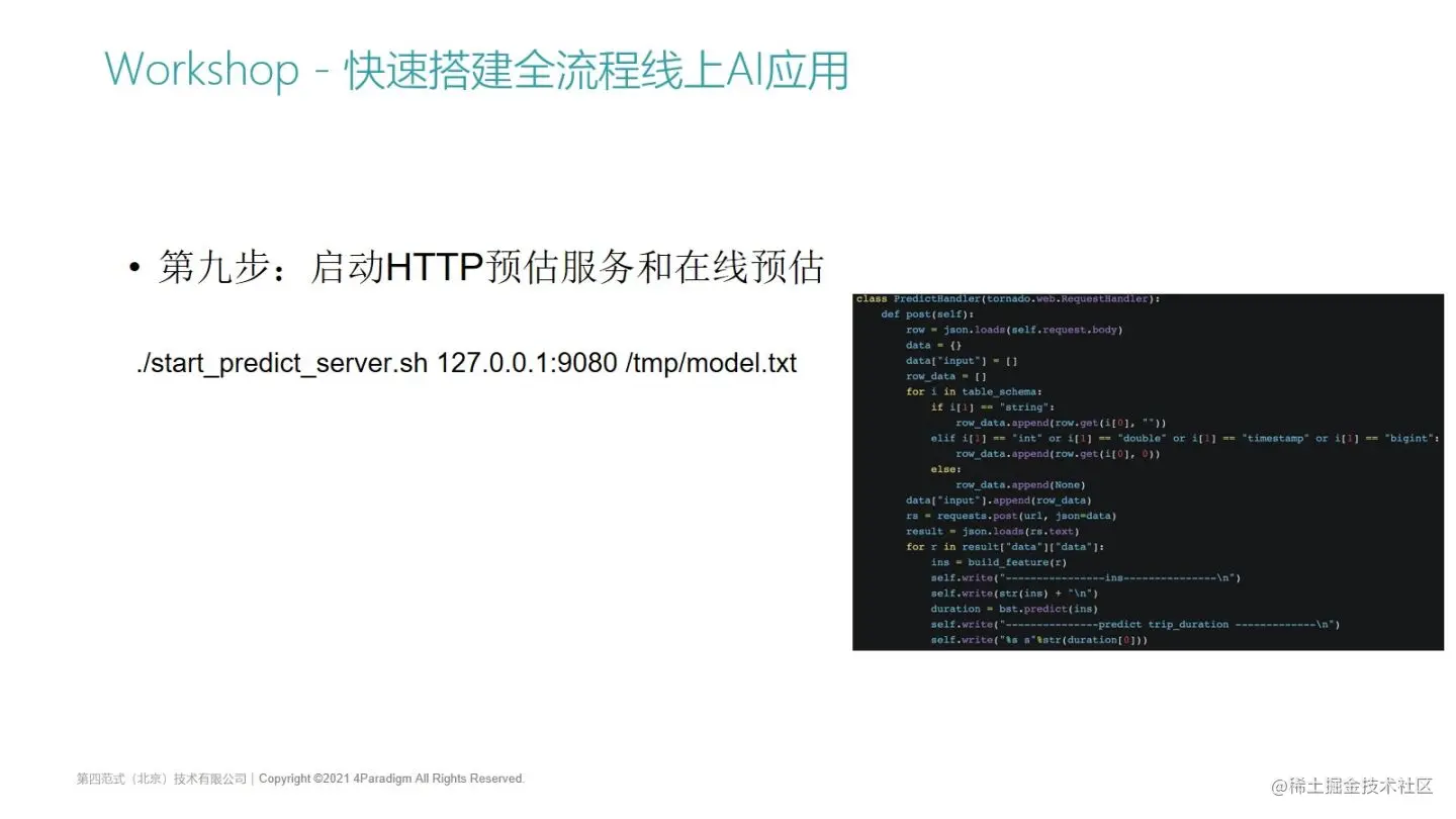 有了导入后的在线数据,第9步我们就可以启动预估服务做在线预估了。预估服务包装了一下,有个叫start predict server的脚本,这个脚本是我们封装的一个很简单的Python HTTP server,HTTP server就会把一些客户端数据包装请求到API server,最后会打印结果。原始数据进来以后,通过特征计算得到样本数据,并且会去加载刚刚模型训练得到的LightGBM模型,要使用模型来接收在线返回的特征样本,然后再把这个预估结果给返回出去。
