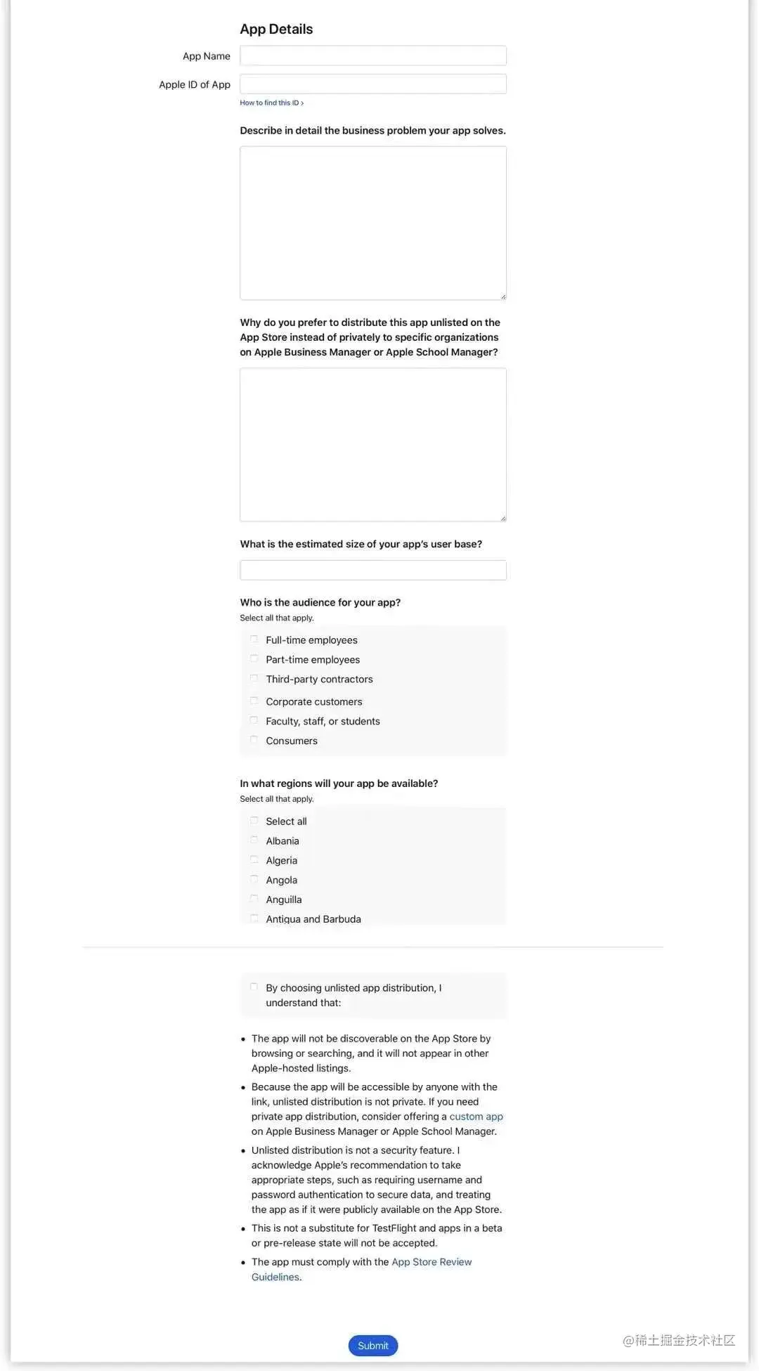 您需要提交请求以接收指向您的未列出应用的链接。如果您的应用尚未提交审核或已获准在应用商店,只需填写申请表。如果您的 app 已获准在 Apple 商务管理或 Apple 校园教务管理上进行私人下载,您需要在应用商店连接,上传您的二进制文件,并在填写请求表之前将分发方法设置为 Public。有关详细信息,请访问设置应用的分发方式。