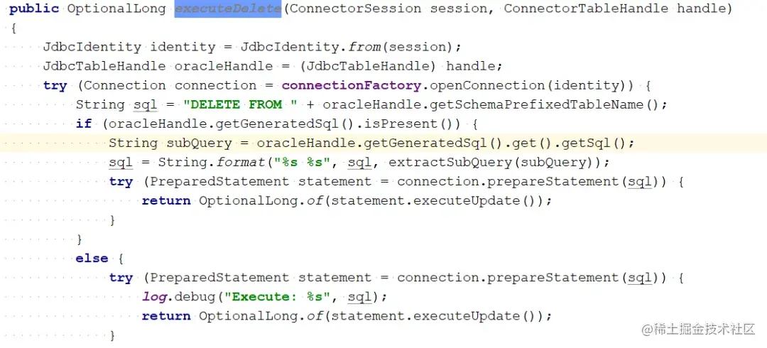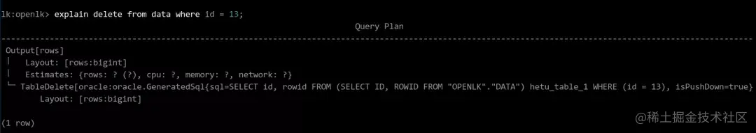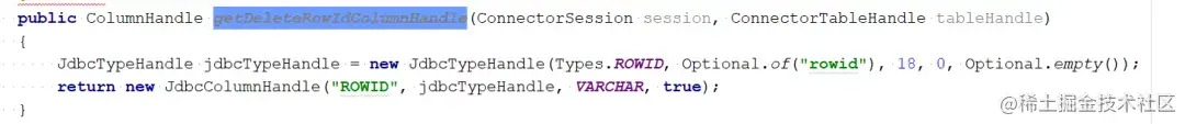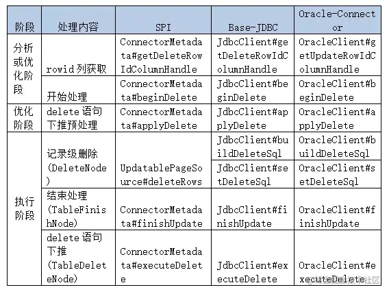 在分析阶段,框架通过ConnectorMetadata#getDeleteRowIdColumnHandle获取rowid列的处理句柄,在Oracle Connector中只绑定Oracle数据源中每个表的隐藏列ROWID列,这个列会在查询数据的时候自动添加到TableScan中。