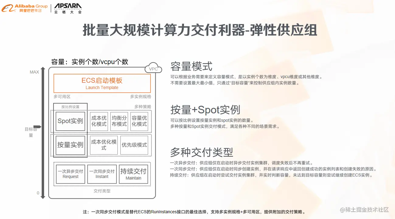 如果你不需要一个具备持续弹性能力的方案,只是需要批量的使用大规模的计算资源, 比如使用1000台机器。我们推荐使用弹性供应组。弹性供应组是为了满足批量大规模计算力交付的场景。比如当前需要10000个CPU,它可以根据使用弹性供应组的容量模式,去设定10000个CPU。系统会自动根据10000个CPU判断,当下需要创建多少实例。同时,你可以根据自己的成本考量,选择是否用按量或者Spot实例,进行配比承载自己的业务需求。