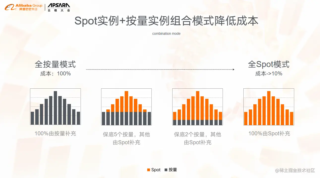 如果当前业务场景基于全按量模式,或者部分按量构建。可以慢慢尝试通过部分Spot实例去替换现有的按量实例。随着Spot比例越来越高,成本也会无限趋近于最低,达到一折的效果。这个时候你肯定要问了,我如果用了这么多Spot实例,如果价格变化导致实例释放了怎么办,我的业务岂不是都会受到影响了?所以在这个基础上我们提供了更多能力来规避这个问题。