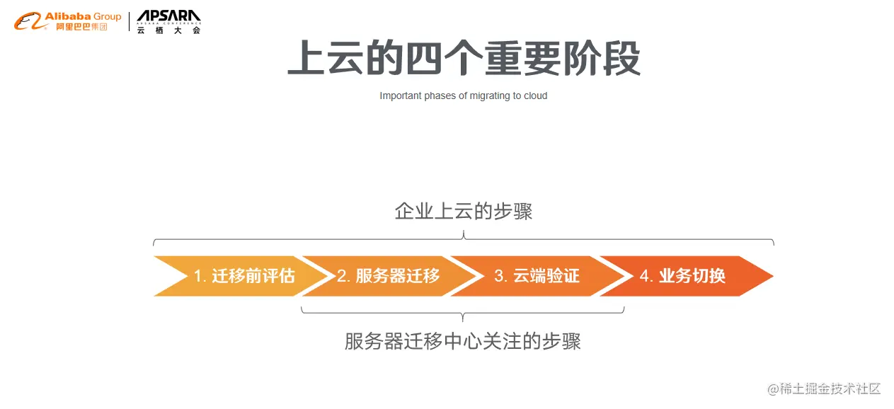 我们把上云分为四个阶段:上云前整体评估、上云迁移的过程、上云迁移的验证、线上业务切换。我们今天带给大家的服务器迁移中心产品就是帮助大家优化迁移的过程和迁移的验证,让这一部分更快速高效的进行。
