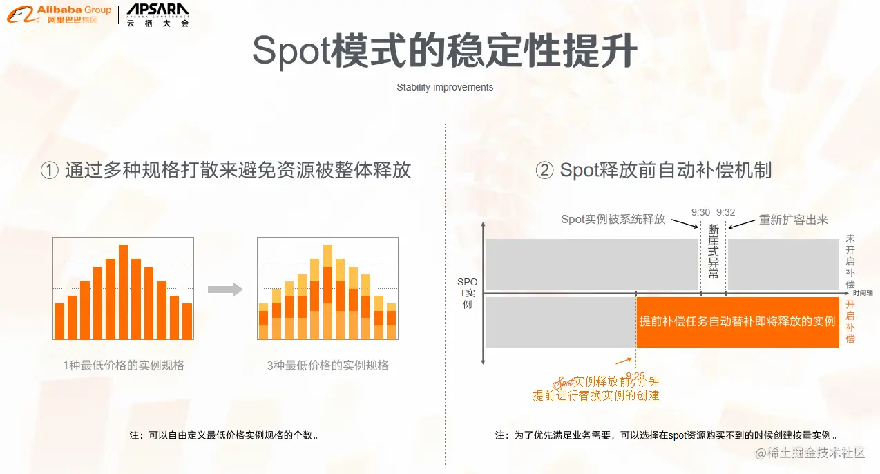 首先,Spot实例规格全部承载自己的业务场景,如果Spot实例价格过高了,所有业务全部被释放。所以我们推出了针对Spot场景的优化,当你使用Spot实例的时候,可以设置多个最低价格的实例规格进行创建,比如3种,如图中左边所示,通过多种实例规格打散的方式,可以避免单一实例的释放导致的问题。