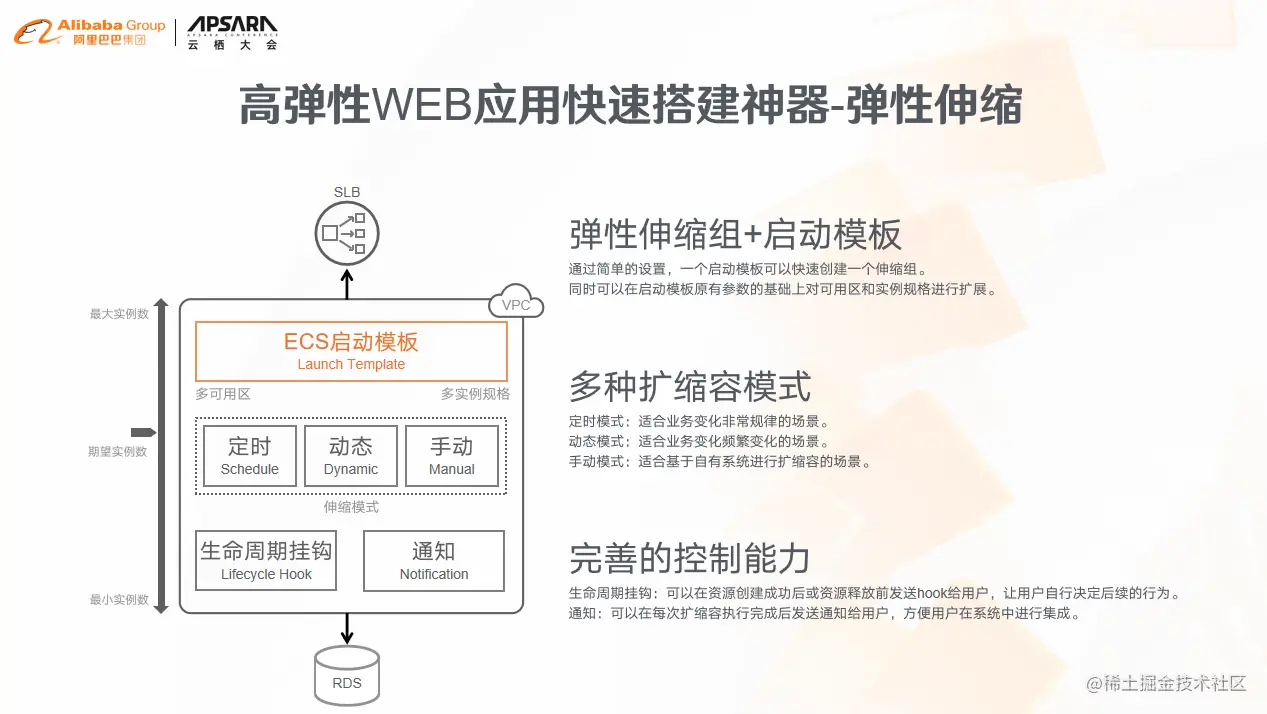 除此之外,如果你想对整个过程有更全面的控制能力, 我们还提供生命周期挂钩的能力,比如伸缩组在帮你缩容资源的时候,你发现实例上还有一些日志文件需要备份,则可以通过生命周期挂钩拒绝当前的缩容行为,伸缩组可以帮助继续保留资源;还有通知能力,任何扩容缩容都可以通过钉钉、短信、邮件的方式通知给你。而且伸缩组还可以同时帮你打通实例与SLB和RDS的联通关系,帮忙用户通过这种方式快速构建高弹性的Web能力。