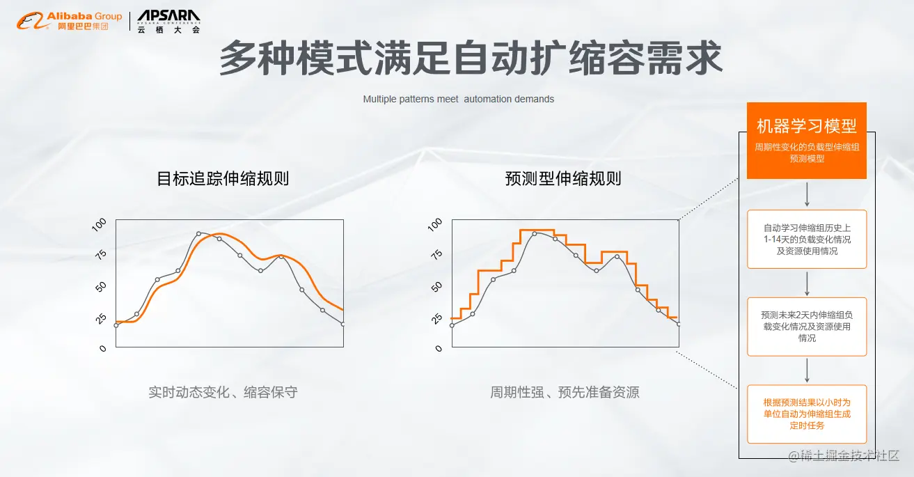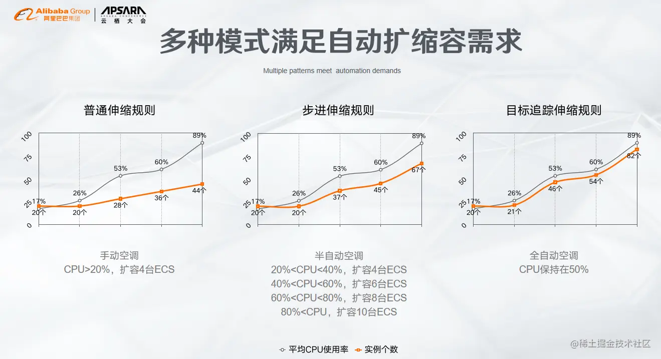 比如它有定时模式,当业务高峰期在早上8点,早上8点会定时去扩容。业务低峰期是晚上6点,在晚上6点定时会缩少机器;第二,可以是动态模式,当CPU超过50%时增加机器,当CPU低于40%时缩减机器;第三,手动模式,用户自己通过本地自建系统来触发伸缩活动。