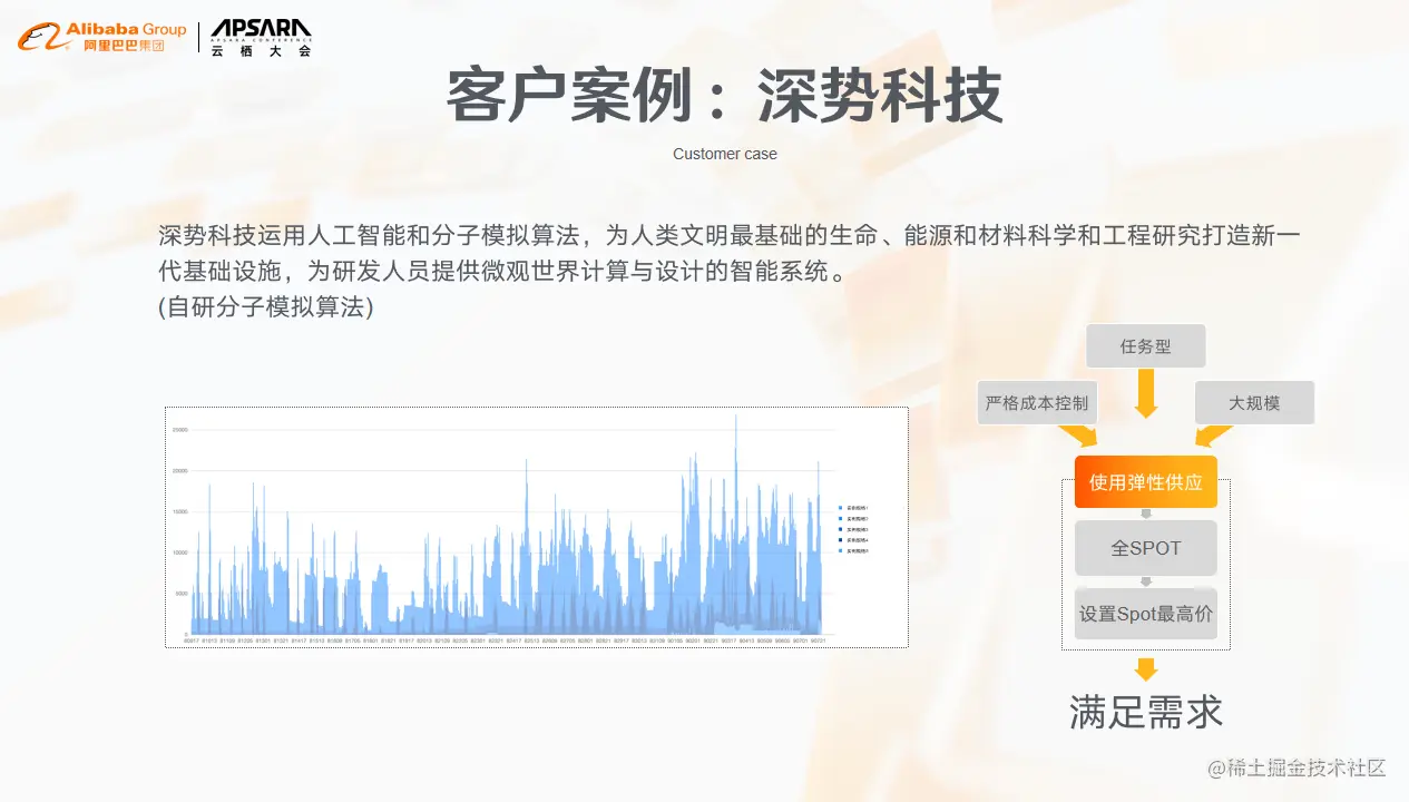 第二个客观例子是深势科技,一家做人工智能和分子模拟算法的公司。它的特点是全部以交互型任务为主。每次跑任务都需要大量资源和严格的成本控制。所以在这个场景下,选择了全Spot方式。把成本降到最低,同时每次也设置它的Spot最高值,来保证它不会超出整体的成本边界,最终满足它整体的业务场景。