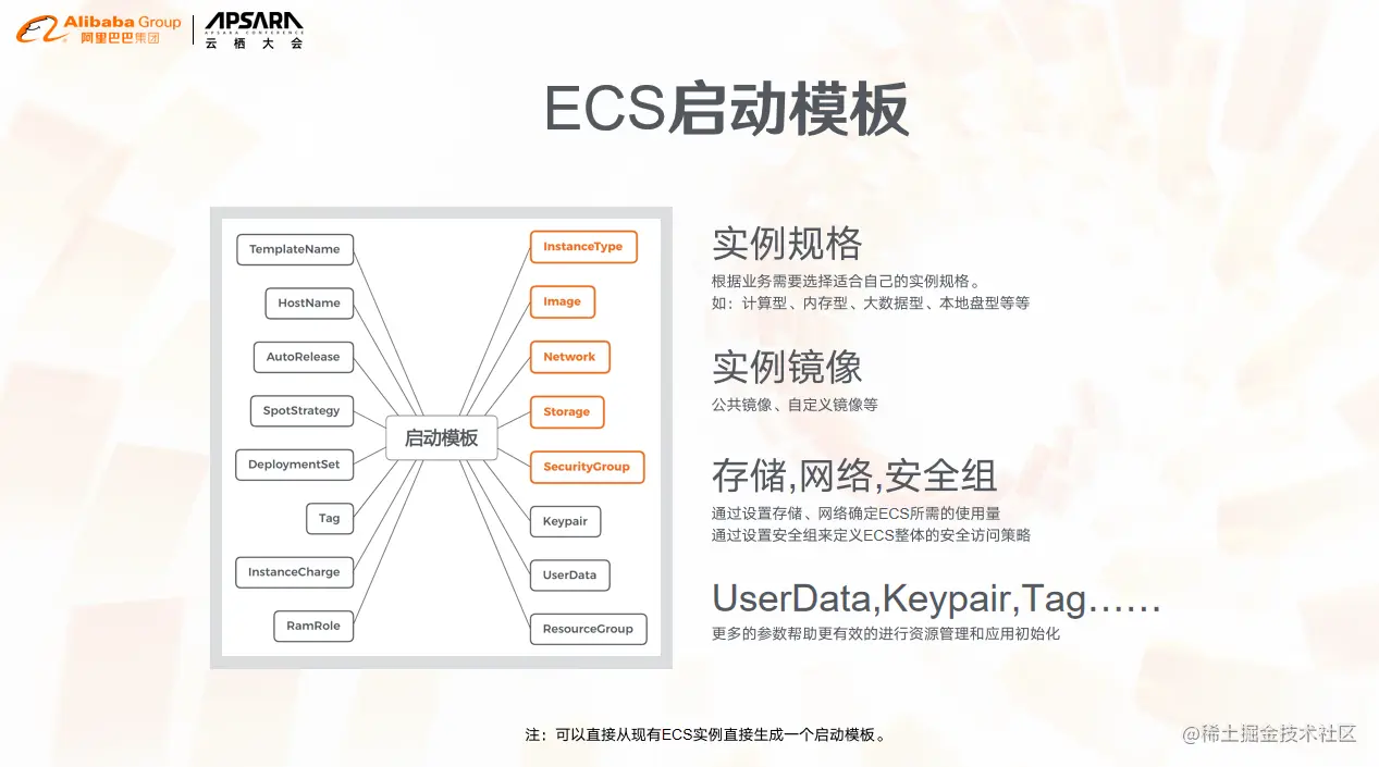 先说高效部分,推荐大家使用ECS启动模板功能。不知道在座的各位来宾有哪位使用过ECS的启动模板这个功能,这是一个ECS配置数据的持久化工具。在阿里云上创建的任何ECS实例,都可以通过它去保存ECS实例的所有配置。后续任何时候,都可以通过这个配置快速创建实例,不再需要重新配置。而且每次的变化都可以通过版本的方式管理。即使之前没用过,想要用起来也很轻松,从任何一个已经存在的实例可以快速的生成一个启动模板,对应的配置就是这个实例的配置。