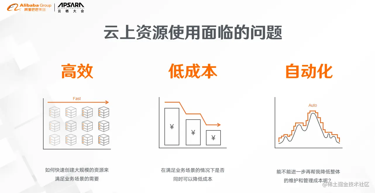 如果大规模使用ECS,第一个问题是如何高效?比如今天有一个业务高峰期,需要1000台机器,我们能不能在最短时间里快速交付这1000台机器?其次,能否以更低的成本使用这1000台机器?第三,这个机器能不能通过自动化的方式,减少人工参与,让管理和维护过程的成本更低?