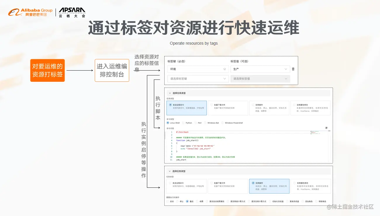 打完标签之后,进入到运维编排的控制台,可以快速对资源进行运维相关的事情。我们在运维编排控台可以找到:发送命令、执行脚本,批量的重启和批量续费等相关操作。