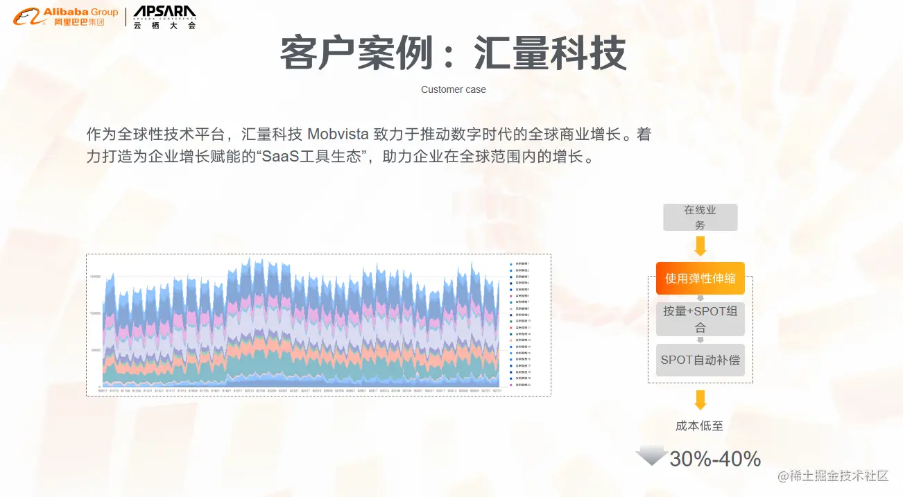 刚才讲完了效率,低成本,还有自动化,我们来看两个客户的例子。首先是汇量科技,它把在线广告业务放在弹性收缩产品上。因为它的最终广告收益,是广告收入减去资源的成本,所以它的资源成本非常重要。同时,它也是使用大批量资源,所以它使用了弹性伸缩产品。然后通过设置按量和Spot的组合,同时开启Spot自动补偿机制,让整体成本控制在3-4折。