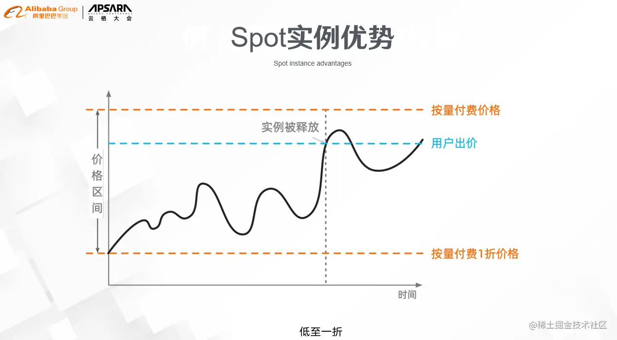 刚才说到要降低成本,以低成本使用这些资源。先跟大家简单介绍一下Spot实例,它是后付费实例。它有两个特点,一个是低价,它的价格在按量实例一折和原价之间。另一个是容易被释放,你可以根据自己的可接受价格进行出价,如果当前出价低于市场价格,这个实例存在被系统释放的可能性。关键特点就是便宜但是有被释放的可能性。