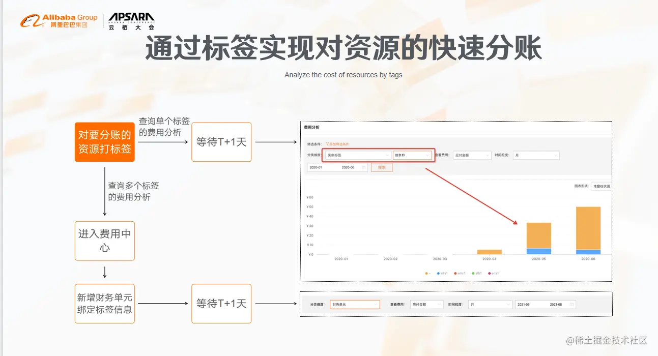 分组之后就可以轻松达到分账,运维的效果。打完相关标签之后,就可以进入费用中心控制台,通过标签,查询对应标签下所有资源费用情况。它可以按月、按天、按小时的展现费用的详细情况,从而达到快速分账的效果。如果你需要查看多组标签交集下的资源情况,则可以通过新增财务单元的方式来开启费用分析,财务单元功能支持绑定多个标签来进行费用过滤,这里需要关注的一点是,标签出账是T+1的,如果你对资源添加标签后,是T+1之后才能看到账单数据。