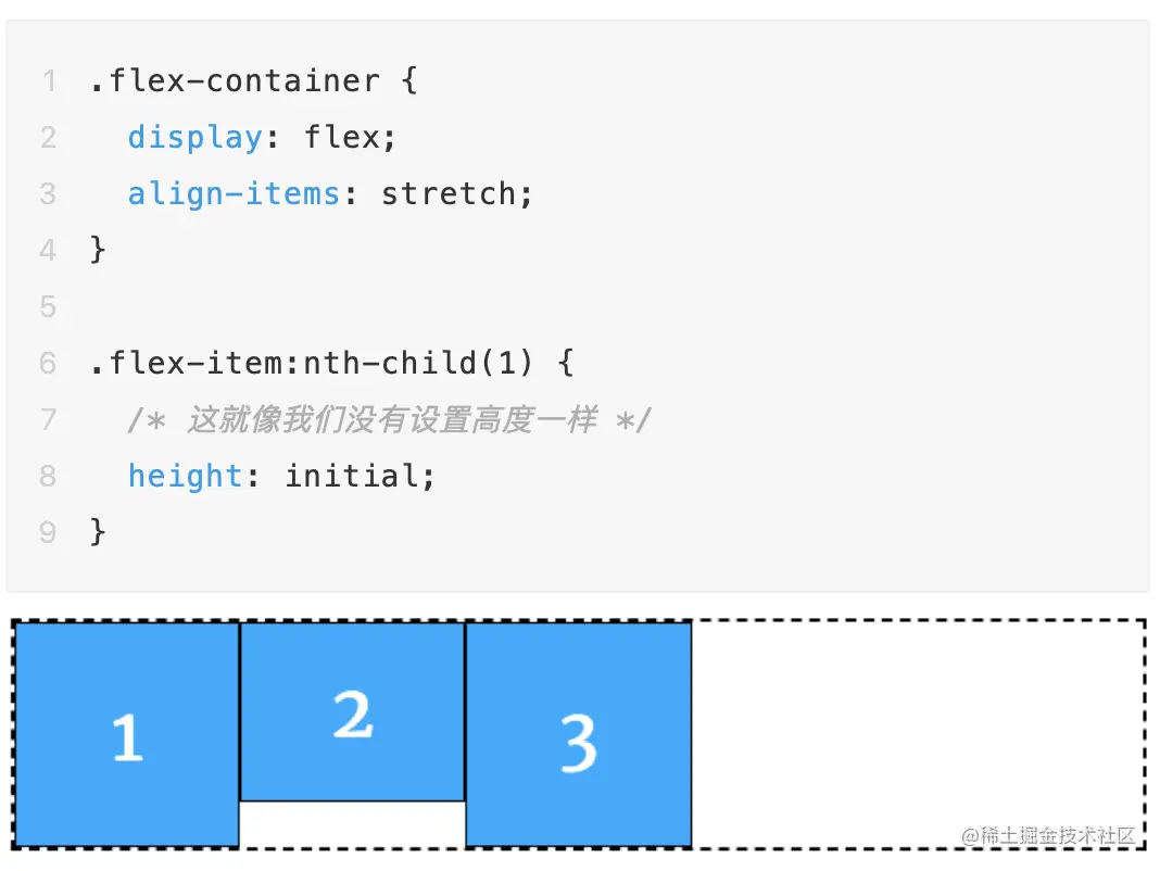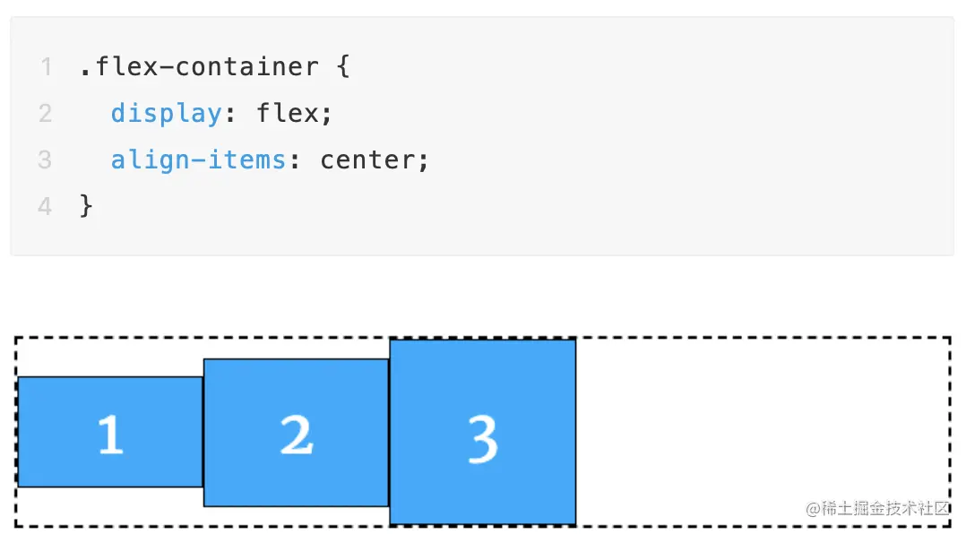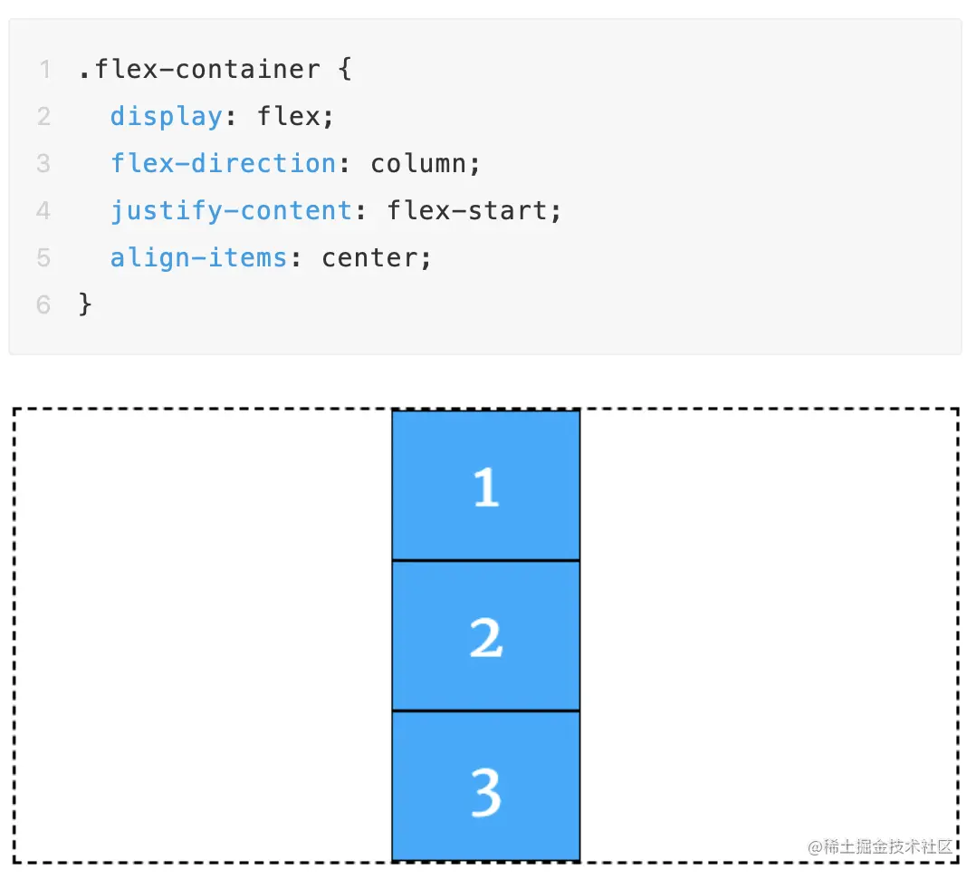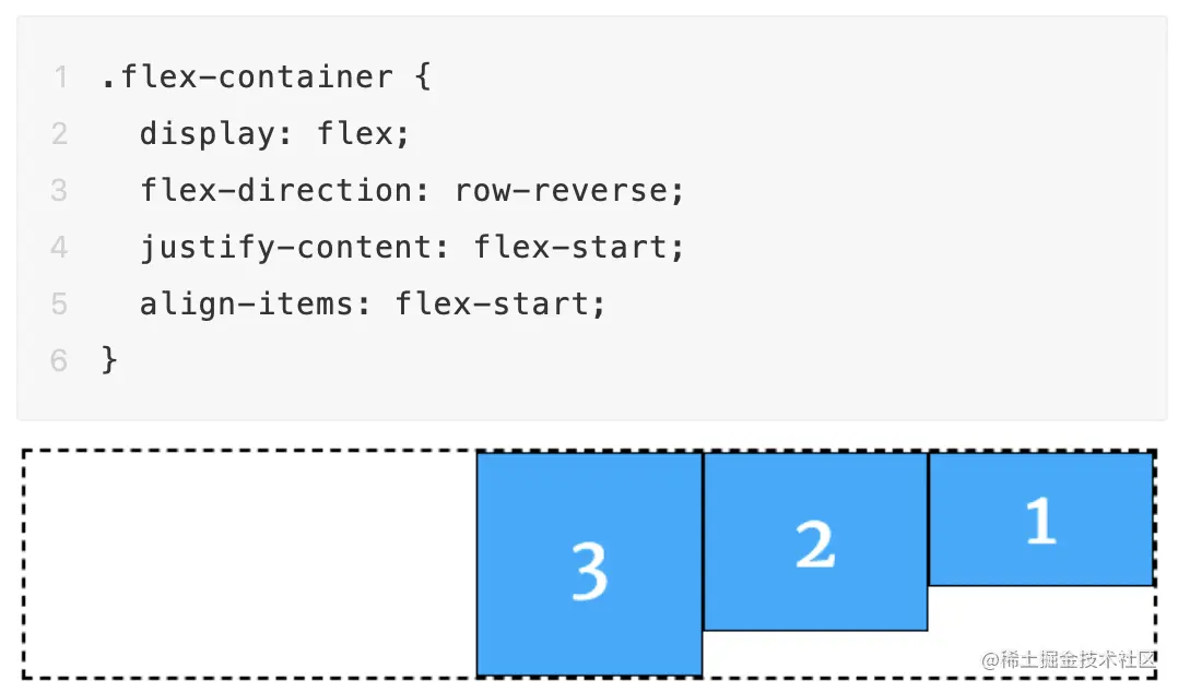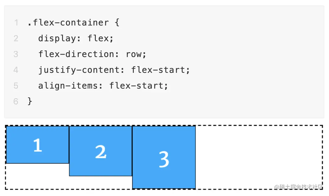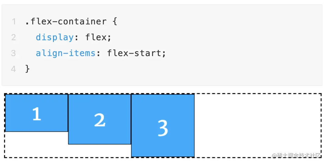 这与 justify-content 的 flex-start 的工作原理相同,但默认情况下将从交叉轴的顶部开始。