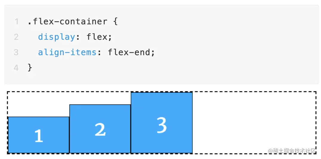 这与 justify-content 的 flex-end 的工作原理相同,但默认情况下将从交叉轴的底部开始。