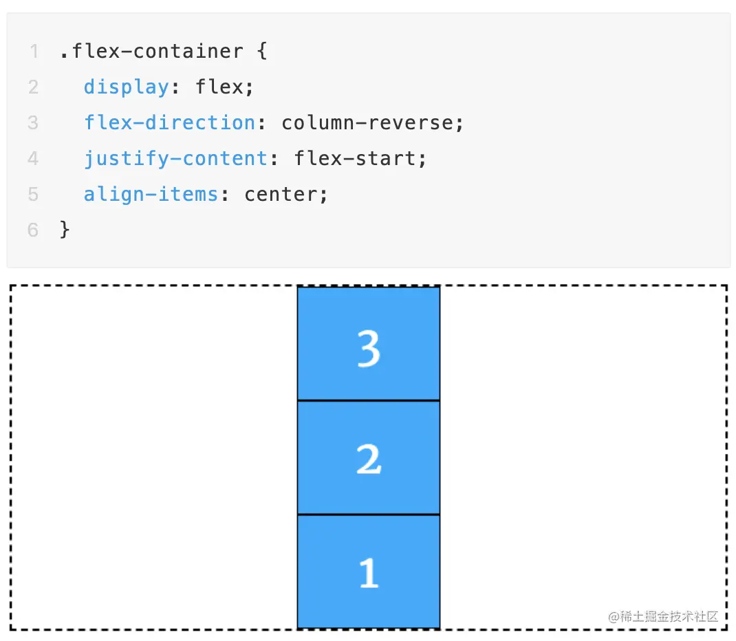 column-reverse 方向与 column 基本相同,但它反转了主轴的方向,因此现在项目从容器的底部开始。