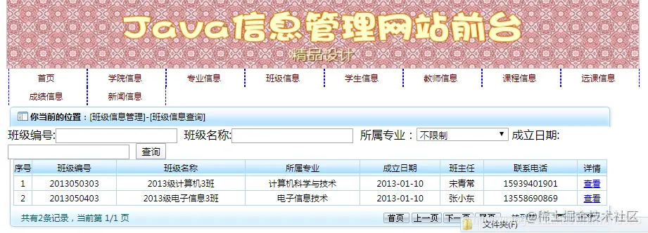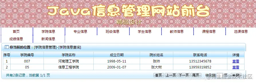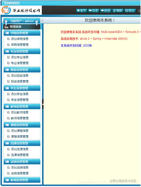 本系统基于spring+struts2+hibernate开发完成,系统分为前端展示和后台管理数据管理。主要功能模块包含:学院信息管理、专业信息管理、班级信息管理、学生信息管理、教师信息管理、课程信息管理、选课信息管理、成绩信息管理、新闻信息管理和系统管理几大模块。前端用户在前台可以查看相应模块数据信息。