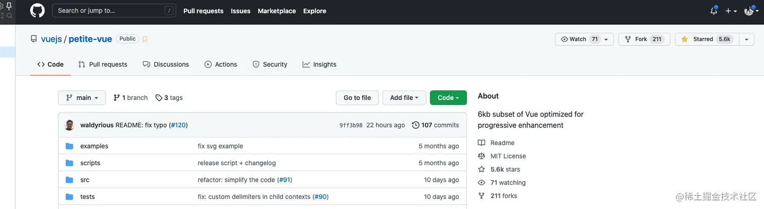 也就是说,petite-vue,它在提供 vue 基本功能的同时,还能一个轻量级,简单应用的微框架,这样也能保证开发者有一个不错的使用体验。