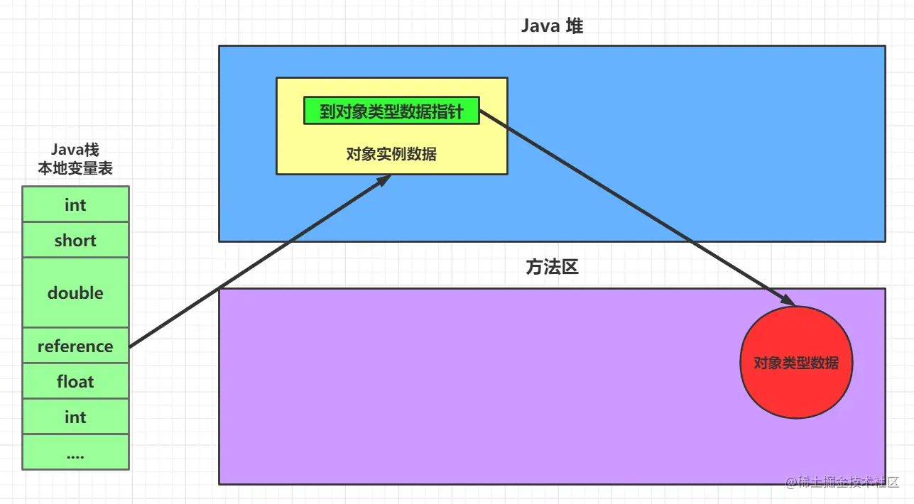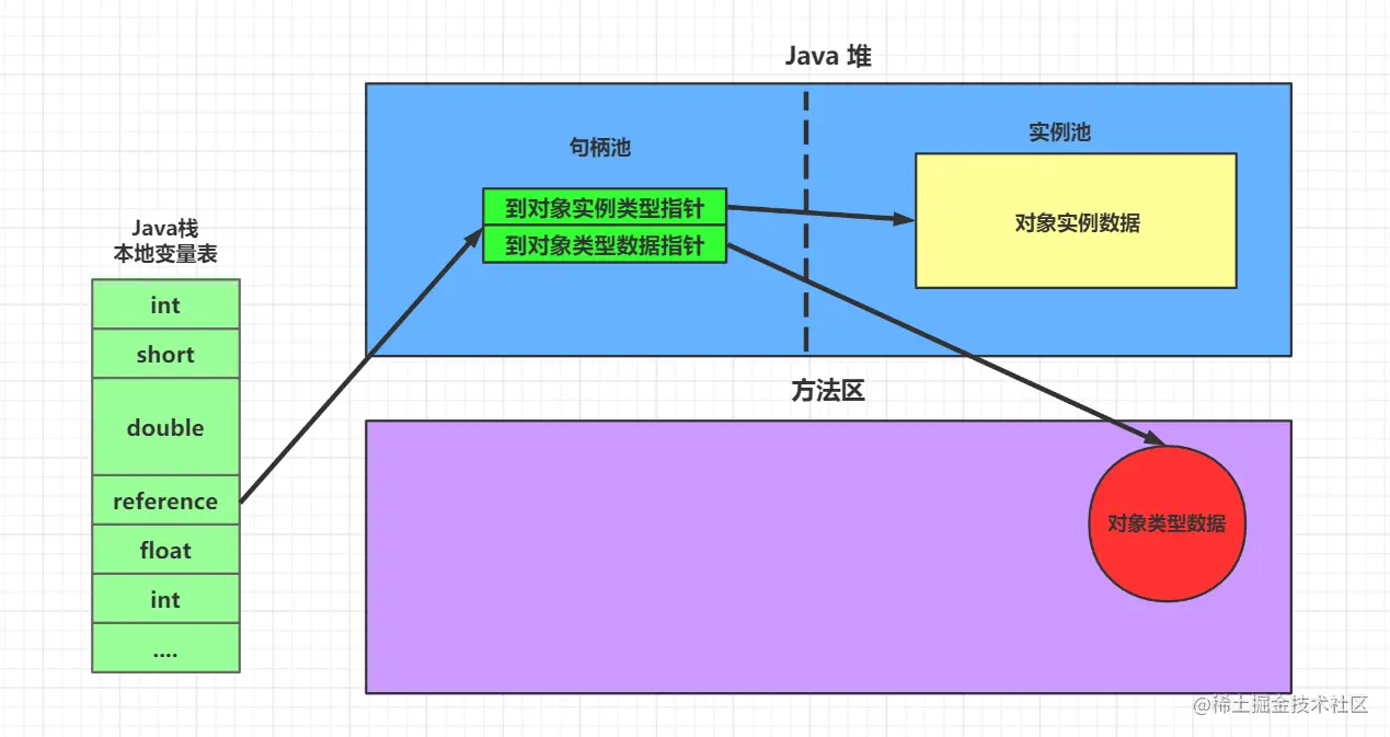 由于reference类型在java虚拟机规范中并没有定义这个引用应该通过什么方式去定位,所以对象访问方式也是由虚拟机自己决定的,主流的访问方式主要有两种:直接指针和句柄访问