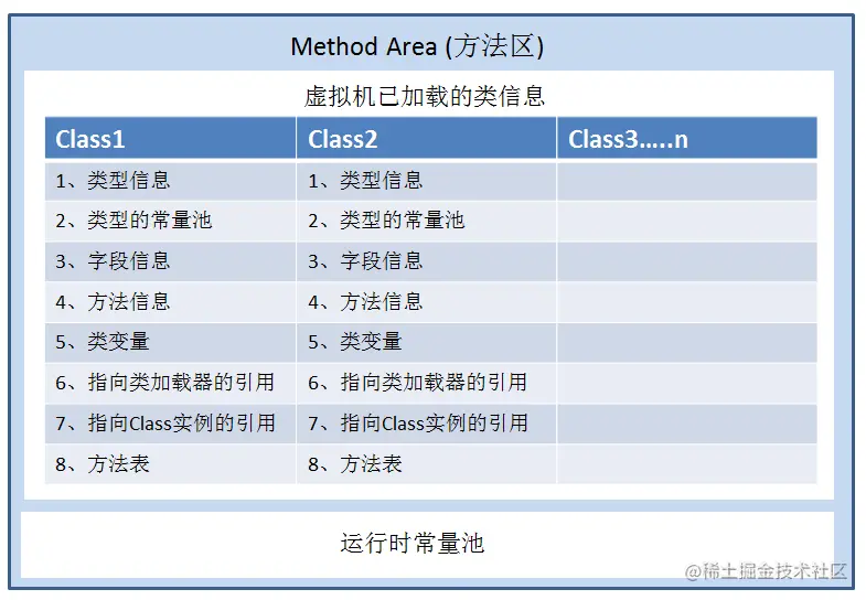 方法区与Java堆一样,是各个线程共享的内存区域,它用于存储已被虚拟机加载的类信息、常量、静态变量、即时编译器编译后的代码等数据。即方法区里存放着类的版本、字段、方法、接口和常量池(存储字面量和符号引用)。