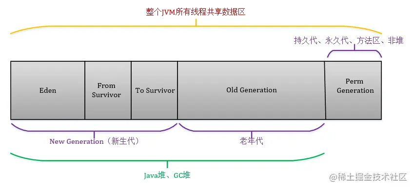 1.JVM中共享数据空间可以分成三个大区,新生代(Young Generation)、老年代(Old Generation)、永久代(Permanent Generation),其中JVM堆分为新生代和老年代,新生代跟老年代的比例默认为 1:2