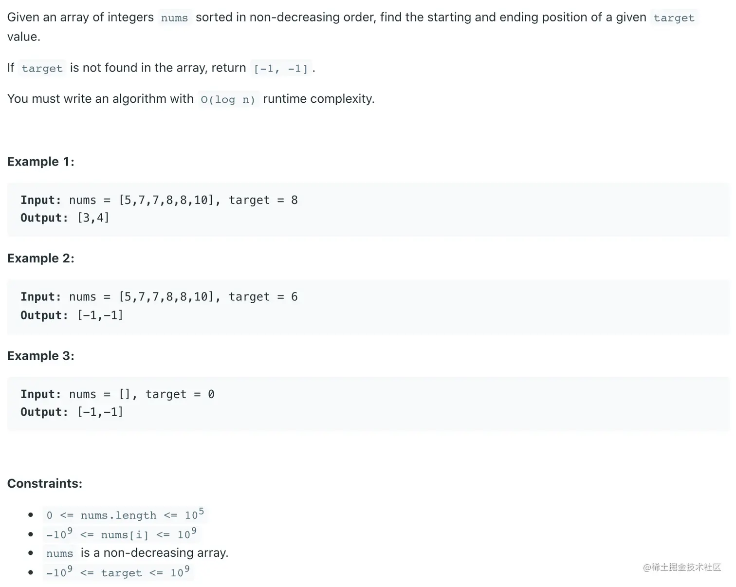 方法: 先二分找起点,再二分找终点,算法复杂度即为O(log n),主要需要注意二分终止条件。