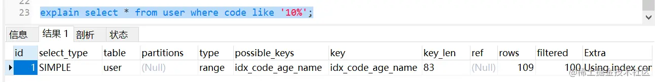 | 1 | SIMPLE | user | NULL | ref | idx_code_age_name | idx_code_age_name | 83 | const | 1 | 100.00 | NULL |