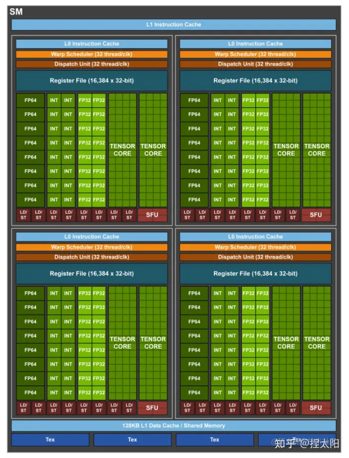 - 8个 LD/ST Unit =》装载or存储单元,同一时钟周期下只能执行装载or存储