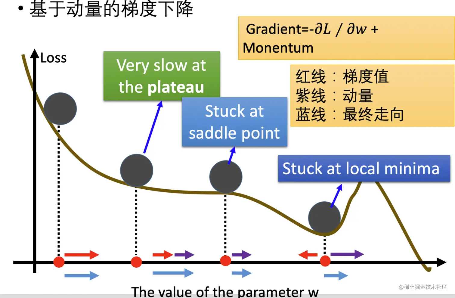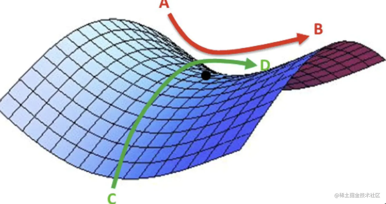 - 点位三:此处是鞍点,梯度下降等于0,动量的紫色箭头方向也是向右的,所以向右运动。
