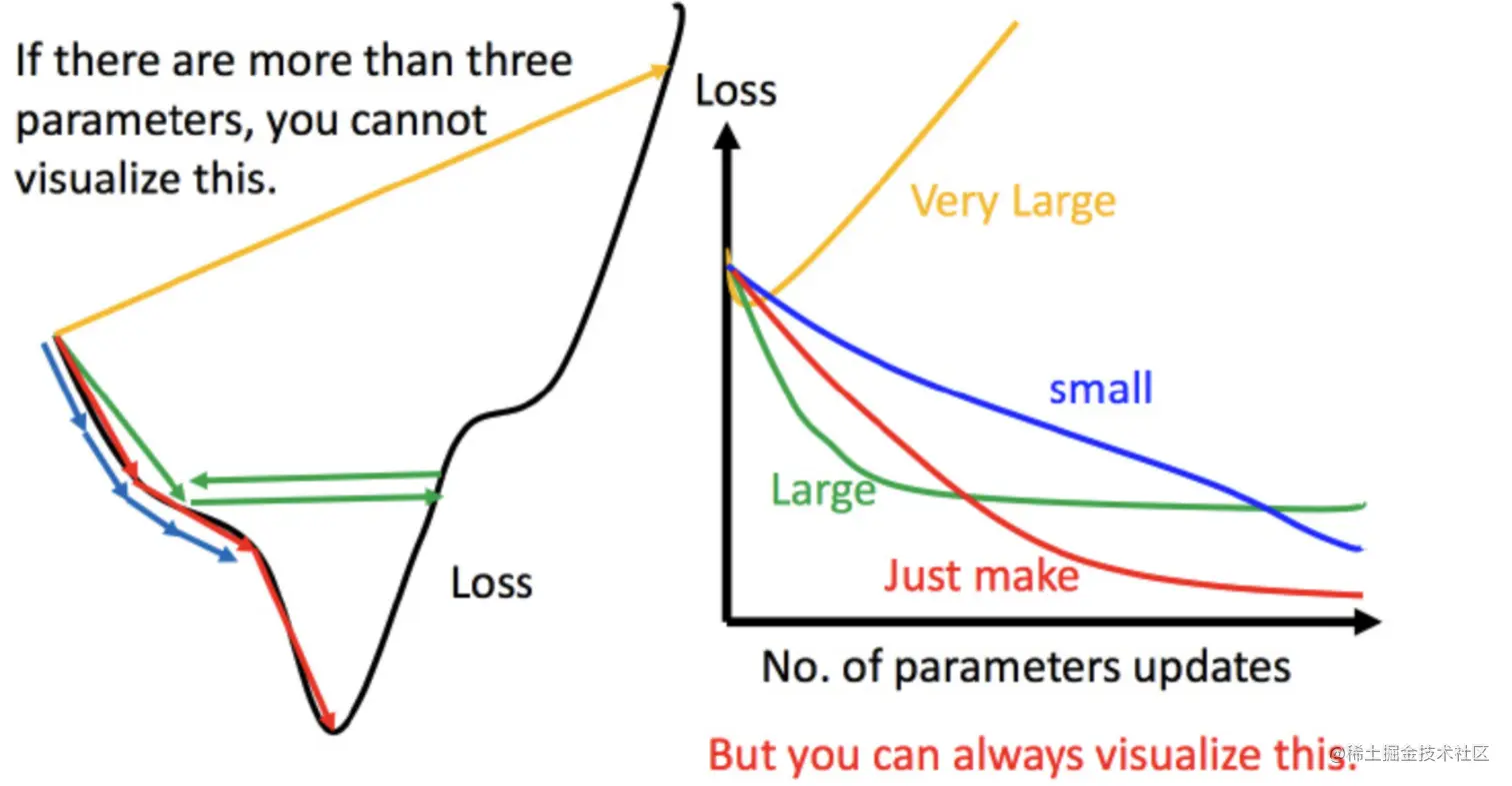 - 如果学习率调整的非常大,比如黄色的线,直接就飞出去了,更新参数的时候只会发现损失函数越更新越大。