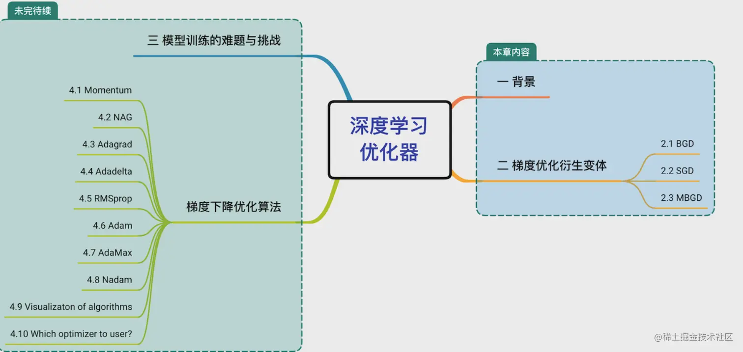 这篇文章主要对各种梯度下降优化算法进行全面成体系的分析,帮助相关的算法开发人员在模型开发的过程中选取合适的算法。相对来说,这块内容较多会分成几个章节进行,以下是章节情况,本章会介绍模型训练的相关难题以及高级优化器的优化方向-冲量、自适应学习率。