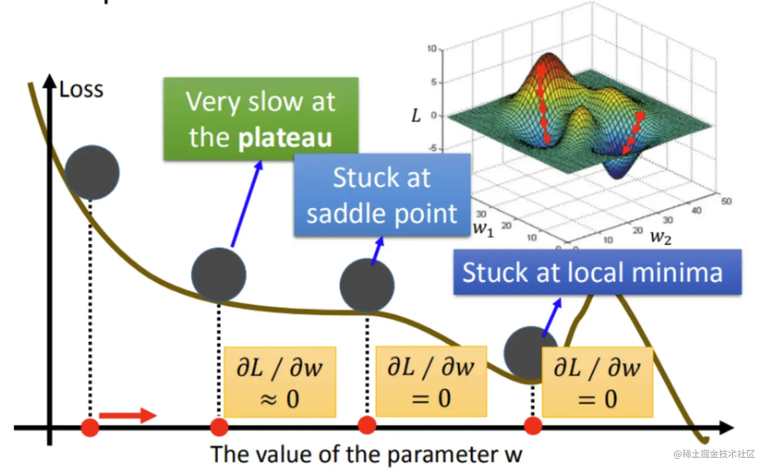 - The Plateau:停滞点位,梯度值近乎于0,所以简单的梯度更新算法十分缓慢。