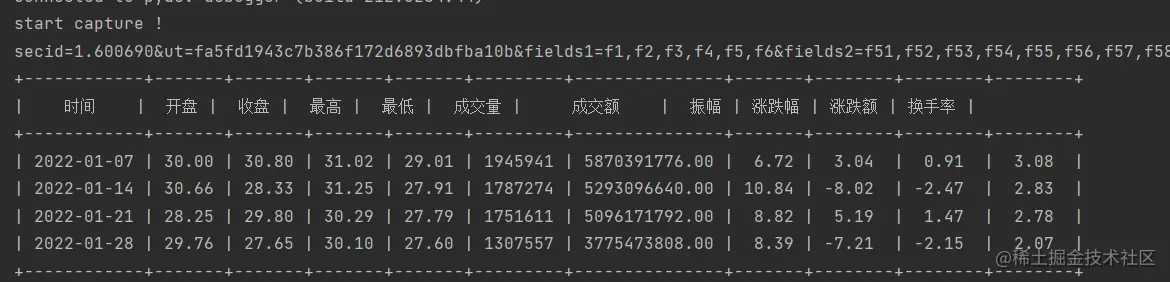 最后打印的结果如下图所示,这里我采用的是周线数据,所以截止到今天位置,刚好是四个周,一共四行数据。