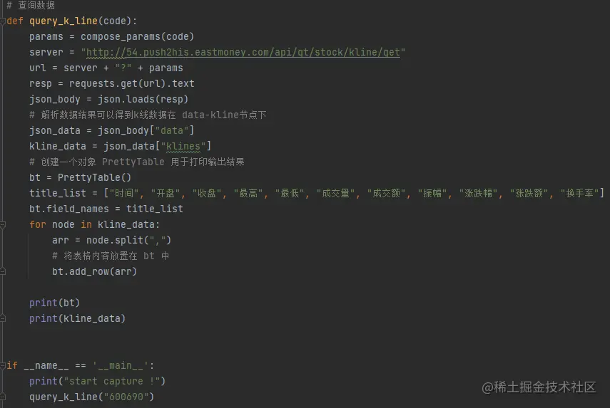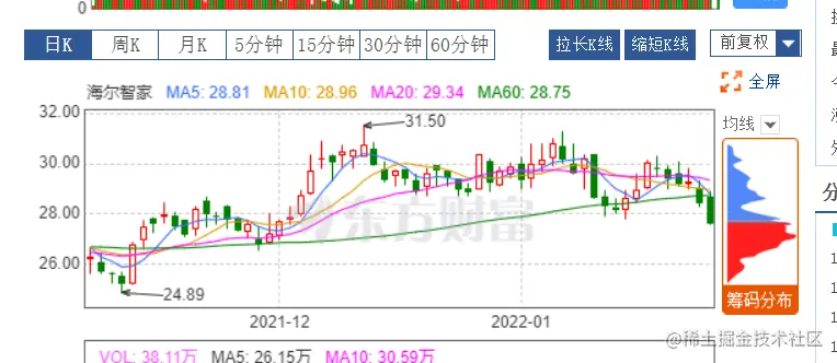 我是非常欣赏东方某富的,因为同为券商,和别的公司确实不大一样,有这互联网的基因,可以这样说,是因为它的出现改变了一些行业的规则。话不多说,这里以海尔智家为例,抓取一下股票的 k 线数据。