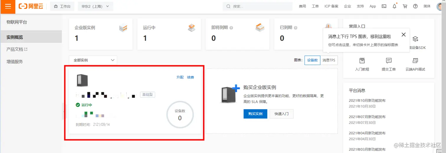 升级完成后您就可以使用企业实例的功能,原先公共实例的设备和数据均保留,无需重新部署,并且可以按照您的需求进行升配、续费以及开通增值服务。