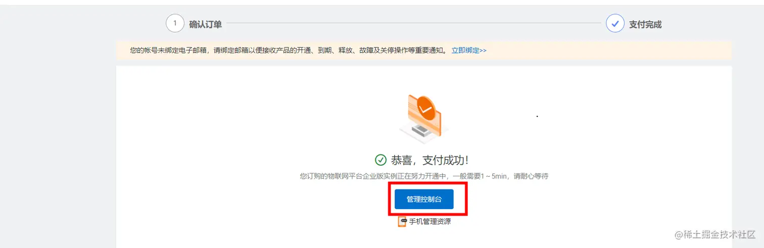 第五步:支付成功后会弹出支付完成的界面,点击管理控制台会进入实例概览界面