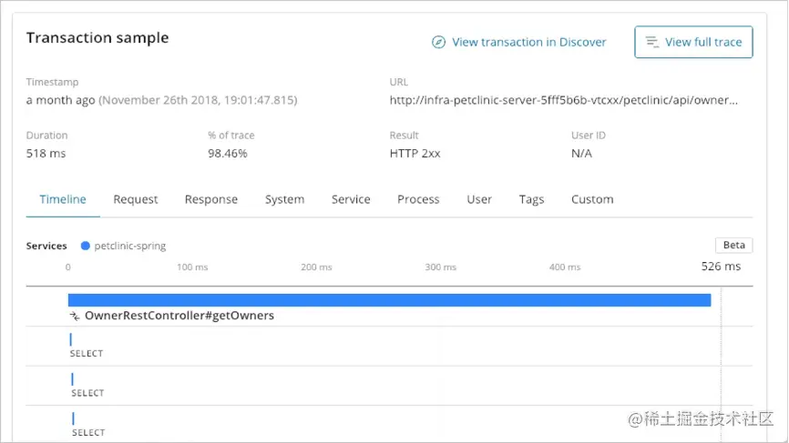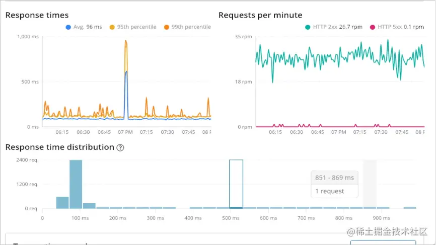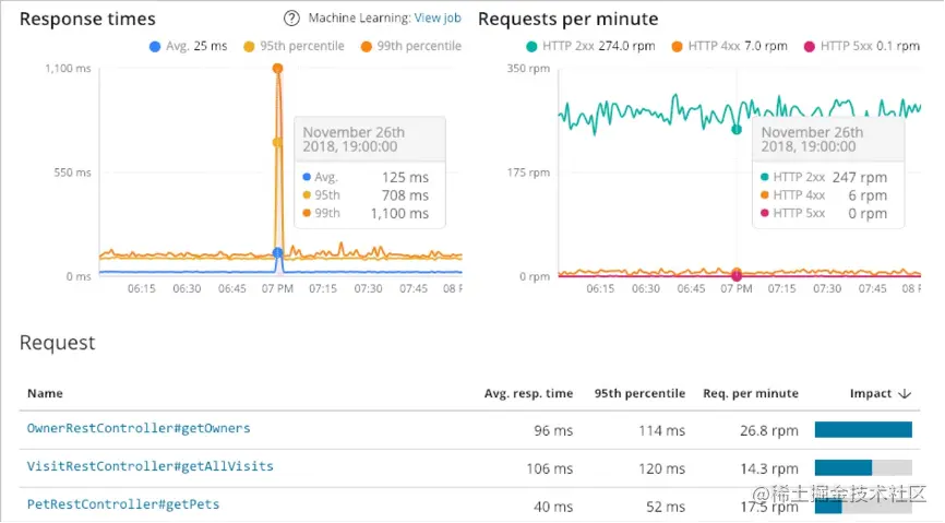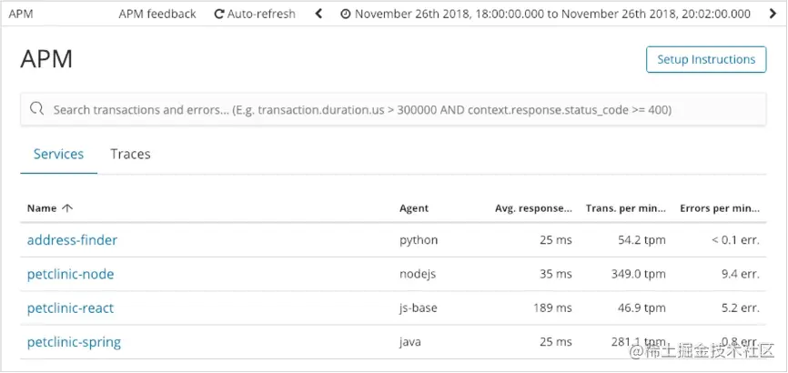 Kibana界面可以查看所有的APM服务数据,如平均响应时长,P95值,异常发生的时间等等。