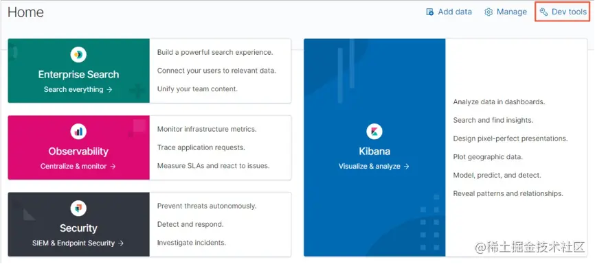 当数据采集之后,我们就可以来到Kibana的界面,通过Dev tools进行一些索引的创建。