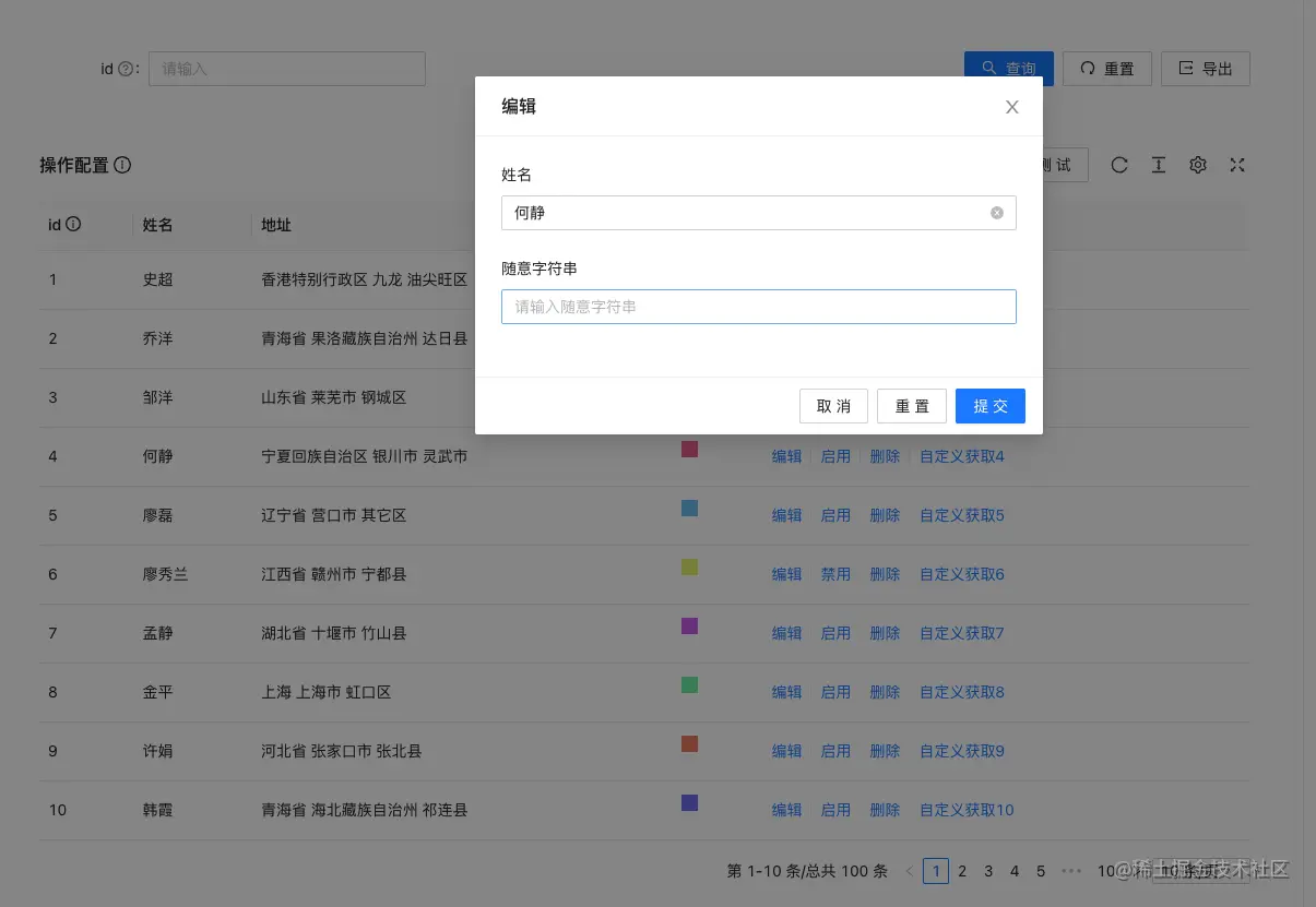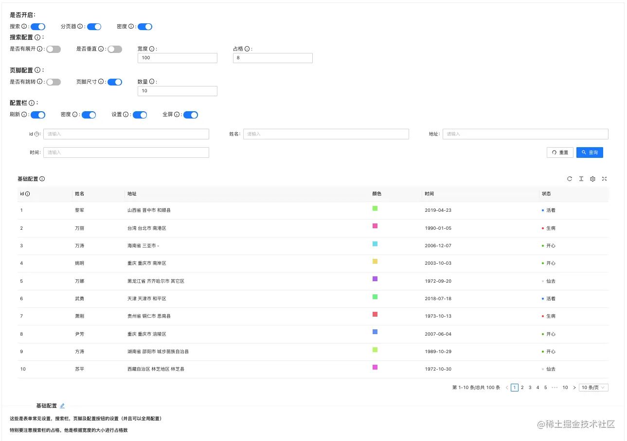 跟动态表单一样,我这里做了二次分装,在这里我将 表格的 分页器、搜索框、工具栏做了简单的配置,并结合Mask.From(弹出表框)实现新建、导出、编辑、状态、删除、自定义按钮的功能,别结合正则对表单搜索做了些额外的处理~