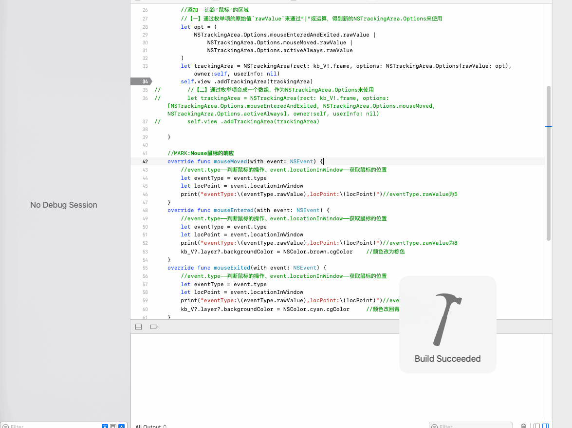效果:a.当鼠标移入到NSTrackingArea(监视区域)的范围时,打印 event.type为8 和(该时刻)鼠标的位置—颜色改为棕色、b.当鼠标在NSTrackingArea(监视区域)的范围内进行移动时,打印 event.type为5 和鼠标的位置、c.当鼠标移出 NSTrackingArea(监视区域)的 范围时,打印 event.type为9和(该时刻)鼠标的位置—颜色改回青色!