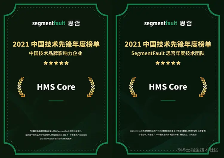 1月15日,中国领先的新一代开发者社区SegmentFault 思否公布了“中国技术先锋年度评选”榜单,HMS Core揽获两个奖项——“中国技术品牌影响力企业”和“SegmentFault 思否年度技术团队”。 此次榜单的评选,SegmentFault 思否依托数百万开发者用户数据分析,各科技企业在国内技术领域的行为及影响力指标综合评选得出,旨在推动更多企业加入开发者生态,帮助开发者成长和成功。